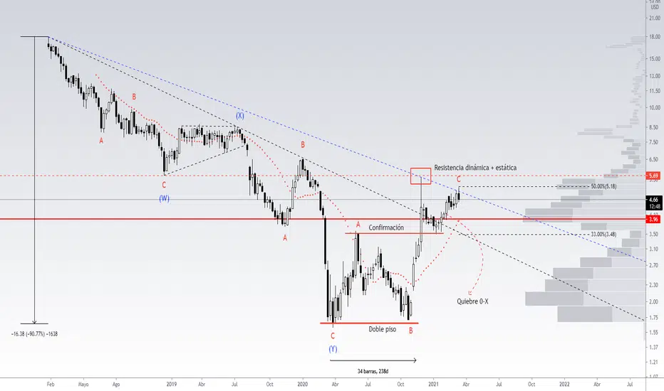 De momento tenemos entonces un ABC al alza, cuya C se extendió al 141% de A y alcanzó el 50% de retroceso sobre WXY. En caso de no poder quebrar la directriz azul que oficia como resistencia, se espera que retroceda máximo hasta la zona de acumulación mencionada y valide nuevamente la línea de tendencia 0-X, esto equivale a un 33% de retroceso sobre ABC, zona 3.50.