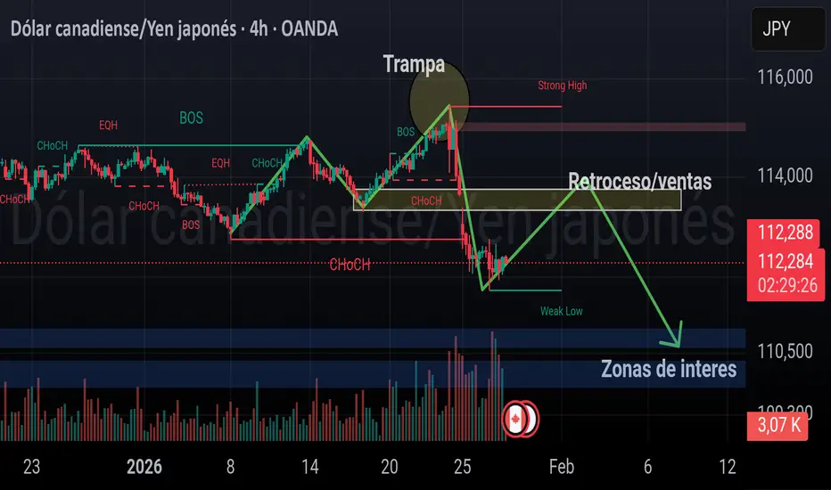 En 4H, el precio ha mostrado un cambio de comportamiento (Change of Character o CHoCH) tras fallar en la creación de nuevos máximos históricos por encima de 115.75 - 116.80.