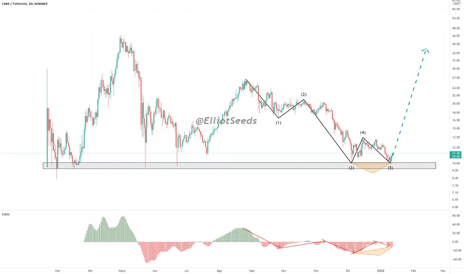 Lo que puedo ver en este grafico del activo es que posiblemente haya terminado una formación de Ondas 1,2,3,4,5 bajista para reanudar su tendencia alcista, además veo que esta en una zona de soporte buena y dejando divergencia desde el final de la Onda 3 al final de la Onda 5 (marcado con un triangulo anaranjado).
