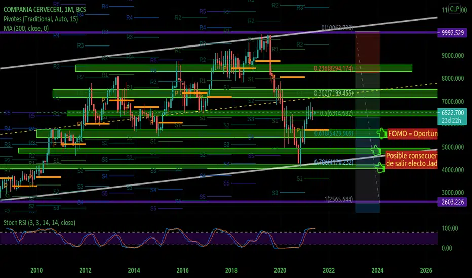 Actualmente existe un temor en el ámbito empresarial sobre el futuro del país, este efecto se ve apoyado por el RSI que nos habla de una "sobre compra" y un pivote central que nos haría bajar hasta el fibo 0,618.