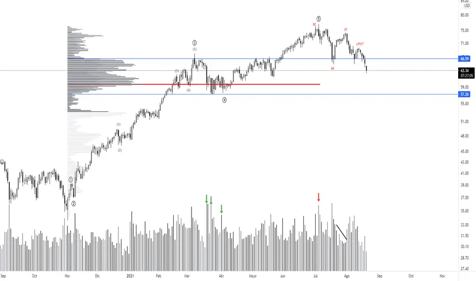 El movimiento bajista iniciado en máximos frena exactamente en el VAH (Área superior del rango de valor) y allí se produce el primer testeo de la oferta, es decir, aquellos que distribuyen se ponen largos con una parte ínfima de su posición para "medir" el grado de demanda, por este motivo, el precio rebota hasta los 77.55 pero con volumen decreciente y dejando una no demanda. No es menor esto, es decir, si la demanda está fuerte debe mostrar Bullish Volume (volumen creciente en velas alcistas y decreciente en las bajistas).