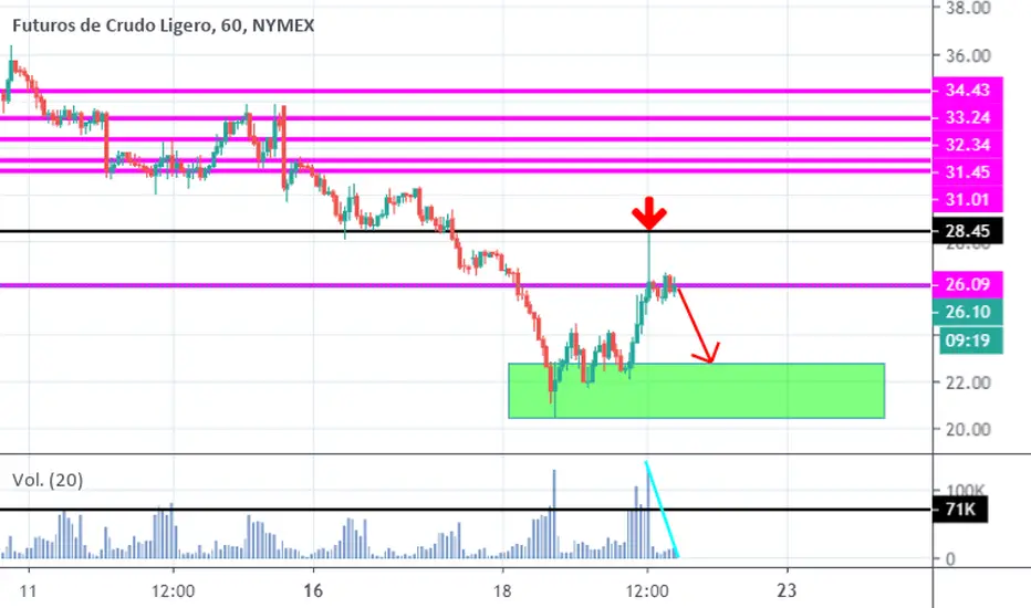 Por contexto, y porque ha venido presionando la oferta, además tenemos una vela con una gran mecha de rechazo con volumen en zona de punto y figura, y ahora la demanda tiene poco interés, lo más probable es que el precio del crudo baje nuevamente hasta al menos la zona anterior de los $22.