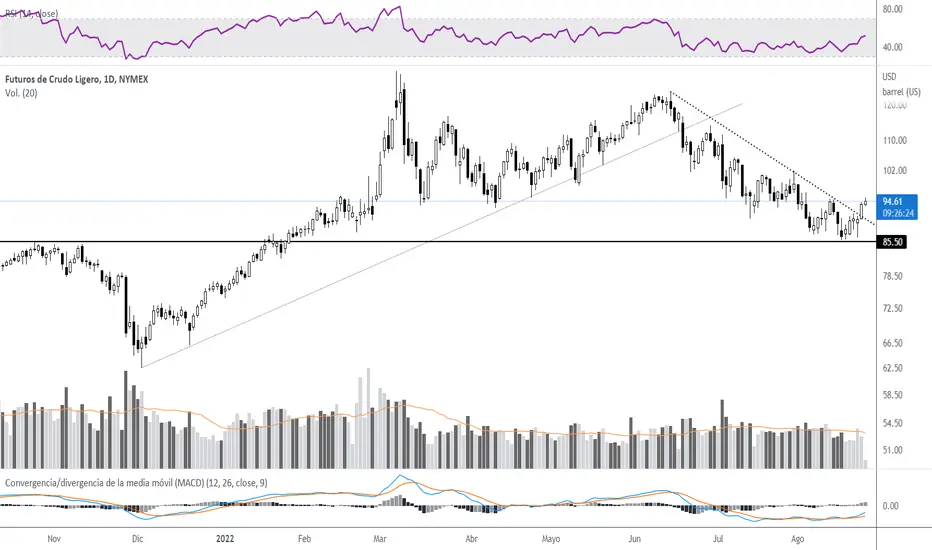 Manteniéndose por encima de la zona clave de los 86/85 dólares, rebotó y logró superar lo planteado en la línea bajista dinámica, yendo por encima de los 91/92 y buscando ahora los 95 que confirmarían la salida.