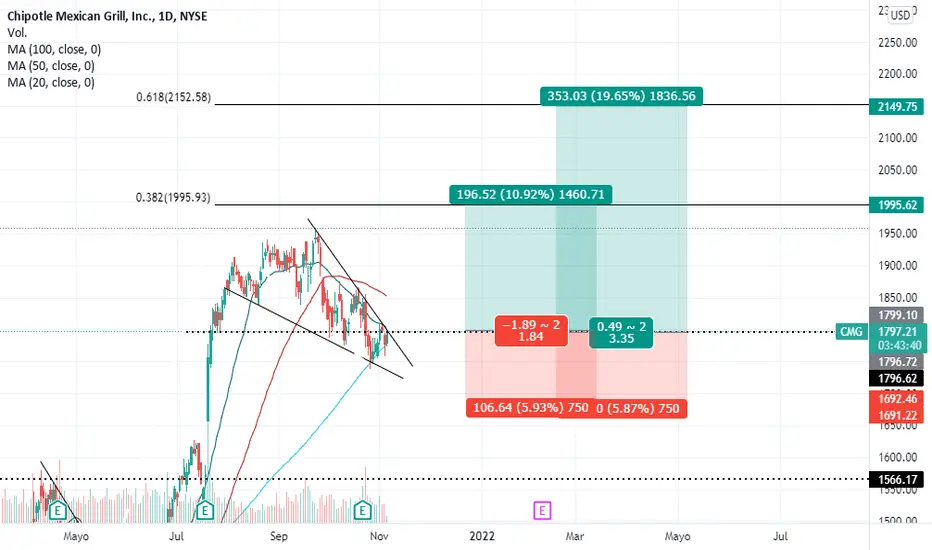 Después del poderoso gap de earnings, el precio consolidó en una cuña descendente, haciendo soporte en la MA100, buscamos posiciones largas en busca de la ruptura de la cuña con dos targets dados por extensiones de fibonacci, y un stop del 5% en la posición.