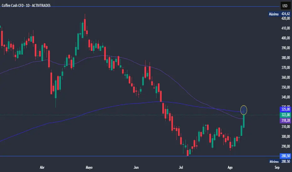 El café llega a subir hasta la media móvil exponencial de 200 días, línea azul, en el 325,00, en donde encuentra algo de resistencia.