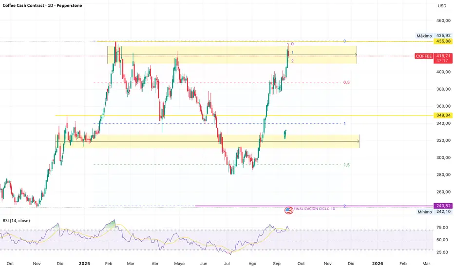Como pueden observar el CAFÉ esta llegando a niveles de BLOQUES DIRECCIONALES (amarillos, los cuales son tomados en 1D, estos bloques tienen la función de distribuir la liquidez por varias semanas) , de momento podemos buscar estructuras internas de rompimiento en 4H y 1H de manera que tengamos ventas SWING , como sabremos hasta donde espera dichas ventas, midiendo ciclos de mercado.