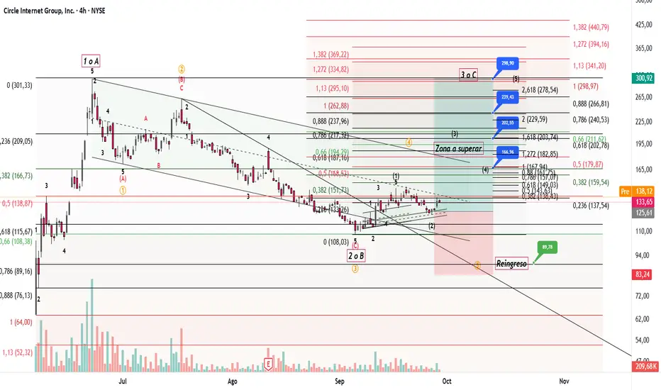 Posición en largo evaluando una posible onda C o 3 después de haber tenido un primer impulso en 5 ondas para 1 o A y después un retroceso en ABC para 2 o B, dado que no sabemos que la corrección haya terminado tenemos una zona de reingreso en el 0,78% de todo el primer impulso para compensar el punto de entrada. Lo que buscamos ahora es el recorrido del 100% del primer impulso, dando posibilidad en un futuro una consolidación de una posible onda 4 para terminar con una onda 5. Proyección basada en análisis con ondas de Elliot.