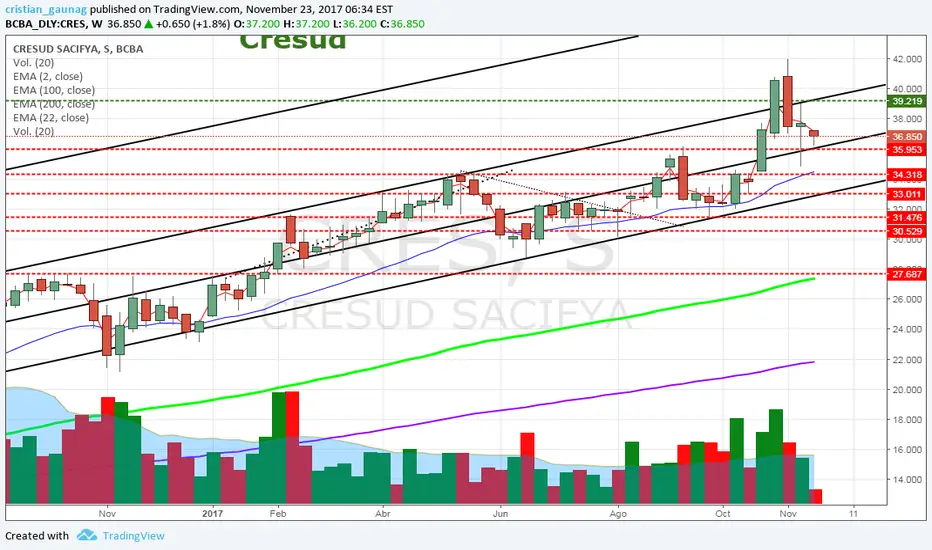 Cresud está cerca del soporte de los $36 que coincide con viejo máximo histórico. En caso de perderlo, siguiente soporte en los $33.