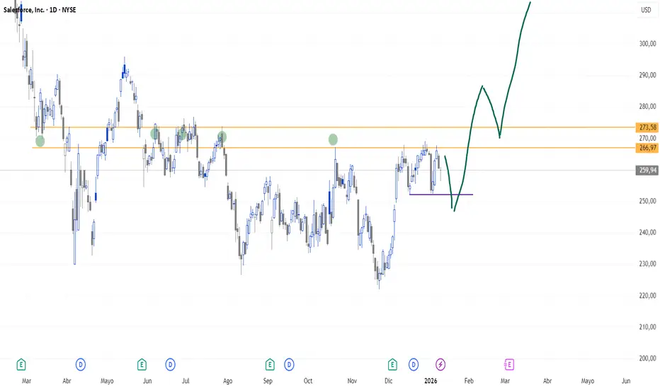 Con una visión de largo plazo, el precio de Salesforce (CRM) se encuentra actualmente testeando una resistencia crítica que ha respetado desde marzo de 2025. El aumento gradual en la demanda sugiere una posible ruptura al alza.