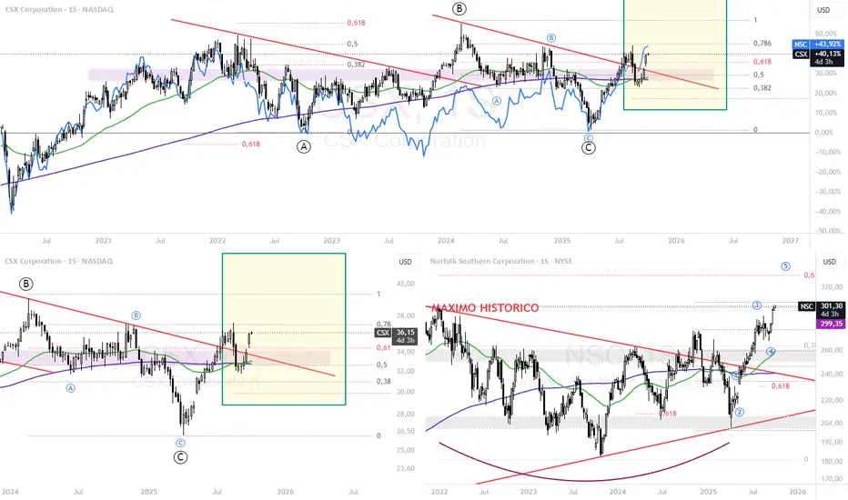 Mientras CSX, en Golden Cross, apoyado en la EMA50, cortando el 0.618 y sosteniendo en la apertura de semana la salida, pudiendo ser un i ii de impulso.