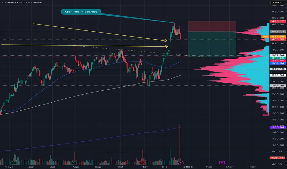 📉 CVNA viene de un rally parabólico y rechaza zona 470–480. Técnicamente luce extendida; retroceso hacia 360–330 encaja como corrección y posible cierre de GAP. En fundamentales sigue cara: el rally fue más momentum/short squeeze que mejora estructural. ⚠️📊