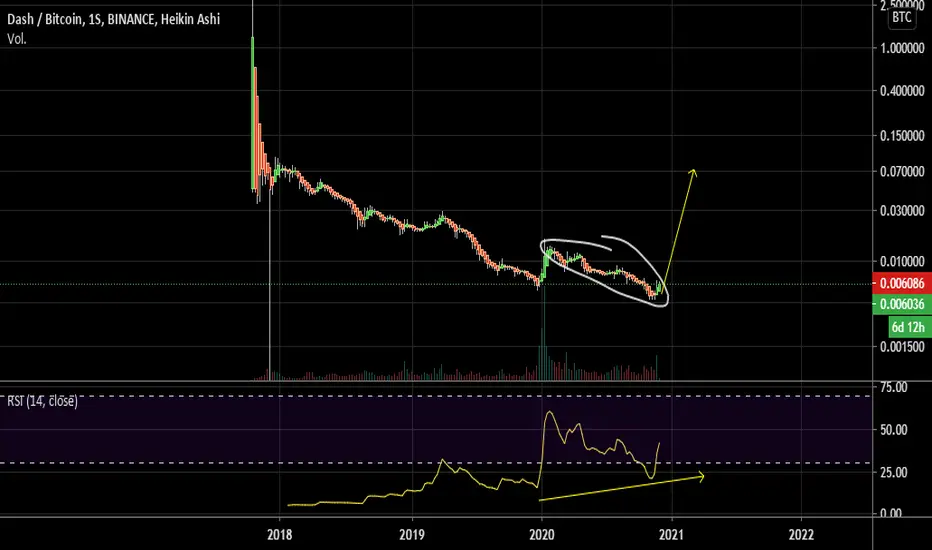 Divergencia alcista en rsi semanal, acumulacion todo 2020, ayer dejo su primer heiking semanal verde , podria subir hasta la sobreventa semanal, es un movimento que vienen haciendo muchas alcoins y/o podria ser la primera de una seguidilla de verdes semanales.