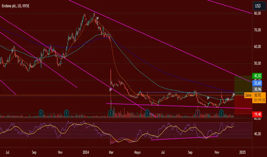 el impulso final que dio mi accion es que en grafico semanal podemos observar una divergencia alcista y un martillo invertido que señalan desde mi perspectiva un cambio de tendencia almenos en terminos temporales y de grafico, puesto que el analisis de la compañia es muy bueno y lleva tiempo consolidando en los precios de entre 20 y 30 usd, podriamos esperar mejores resultados pronto, si observamos el grafico marque unas lineas de tendencia entre los nuevos maximos, lo que nos ayuda a observar como poco a poco ha aumentado el valor del activo y cada ves el precio menor es mas alto, tomemos en cuenta que al hablar de una vision semanal, significa que cada 52 velitas sera un año, asi que el precio facilemente podria no hacer nada en las proximas semanas, pero para mi es una compra clara y de momento no promediare denuevo hasta ver mas volatilidad en el precio y de preferencia ver ganancias tomando en cuenta que nuestro precio promedio es 32.56 a partir de ahi podriamos aumentar el ingreso del capital en tandas iguales aprovechando una tendencia alcista e ir tomando beneficios a travez de los años y las opereciones entre tendencias.