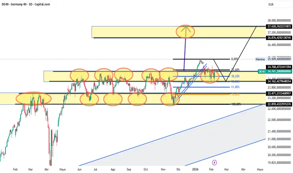 Podemos ver en este análisis técnico una notable tendencia alcista en el Dax (Indice Aleman) con máximos y minimos crecientes que incluso rompe máximos historicos anteriores los cuales se encontraban en un rango lateral bien delimitado con posterior pullback a la zona de anterior ruptura con rechazo de la misma incluyendo rebote en zona de 38,2 y 50 % de Fibonacci para dar paso a posible impulso a la continuidad de la tendencia aprovechando el momentum.