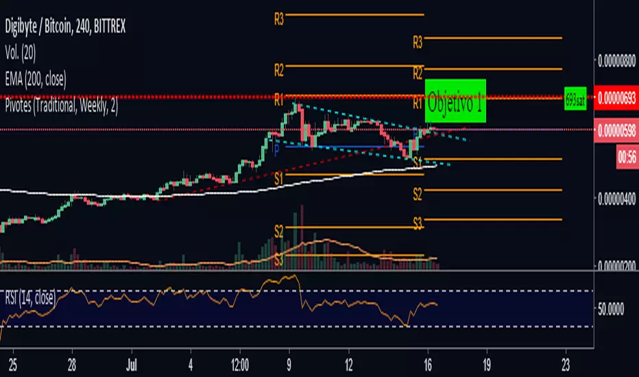 Luego de una subida con ganancias de más de 100% vemos en la gráfica que #DGB después de hacer un pullback retoma su fuerza alcista, actualmente el volumen es alto, los fundamentales han hecho que suba de manera esporádica, Hoy podemos decir que está buscando consolidar su precio en esa zona, este cambio de tendencia fue anunciado en este canal felicidades a los que lograron conseguir buenos profits, a los que están esperando entrada les recomendamos que estén atentos a la confirmación que sería que rompiese con fuerza el punto pivote hacia arriba, recuerden que si van a operar estar atentos con los stop loss.