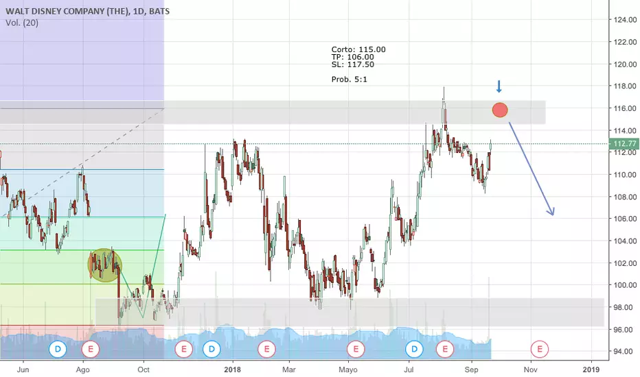 Disney está llegando a un múltiple techo y probablemente un área muy fuerte de romper, esperaremos un impulso débil hacia la zona y desgaste para tomar la posición en corto con los Take Profit y Stop Loss indicados en el gráfico