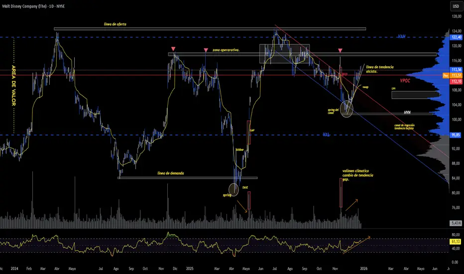 Si la demanda consigue marcar un higher high por encima de 116–118 USD, Disney habilita recorrido hacia: