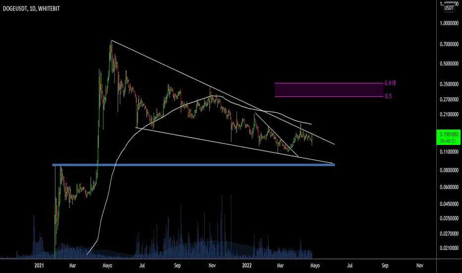 Continúa dentro del proceso bajista en cuña, pero mostrando algunos signos de vida, como la vela actual. Lo principal es romper el techo de la cuña y sostener el movimiento (a diferencia de como sucedió semanas atrás). Con esto claro, superar la MA200 liberaría un movimiento interesante, con posibilidad de ir hacia la zona Fibo, lo que implica un 100% de suba.