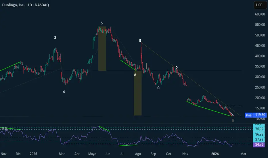 DUOL hace unos días sus fundamentales, me parecieron súmamente interesantes, así que haciendo un análisis gráfico, esperé a este punto en el que se encuentra, donde nos muestra que está en la onda E, por lo que al terminar, podría darse un rebote hacia iniciar un nuevo ciclo alcista, ya mostró divergencia y velas adecuadas de rebote en la zona esperada por la geometrización, por lo que podría ser el fin del movimiento a la baja, apoyado por los excelentes valores fundamentales.
