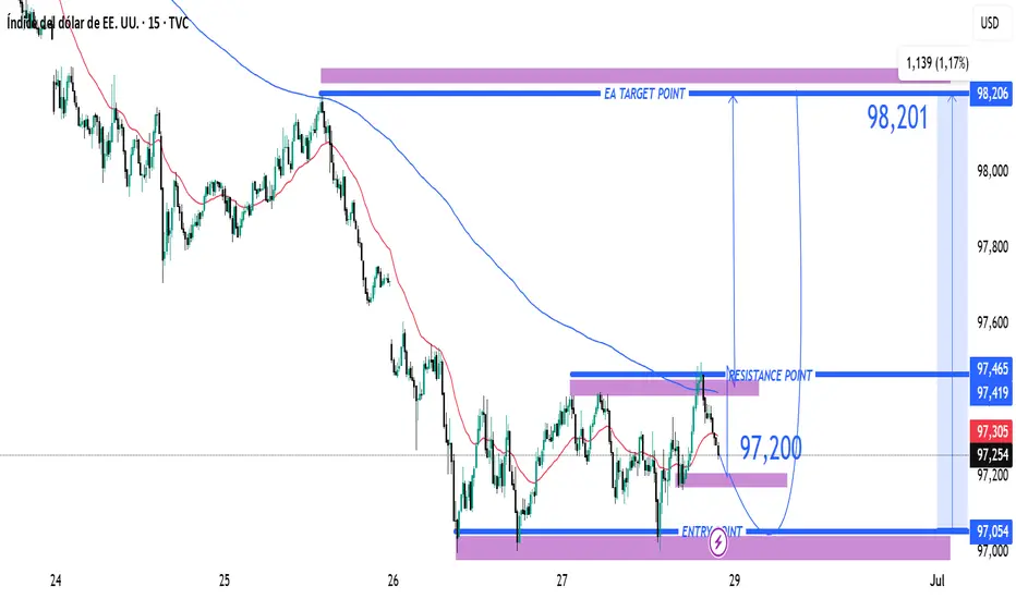 Se anticipa un movimiento alcista desde la zona de entrada (97.000) hasta el objetivo (98.201), siempre que se mantenga el soporte y se rompa la resistencia marcada.
