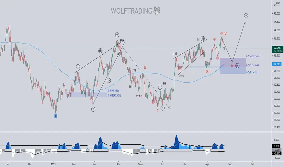 Una de las alternativas para el indice Dolar, movimiento de ABC plano irregular en formacion de onda 4, zona de interes y posible soporte, entrada de onda 5 en 91.85