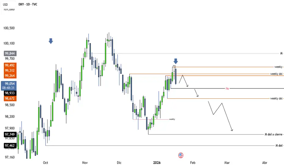 esa alineación se marcó hoy con la divergencia con el EURUSD ya que en el euro se liquidó el mínimo semanal... lo que nos da confianza en que en el dxy el objetivo sea el mínimo de la semana previa...
