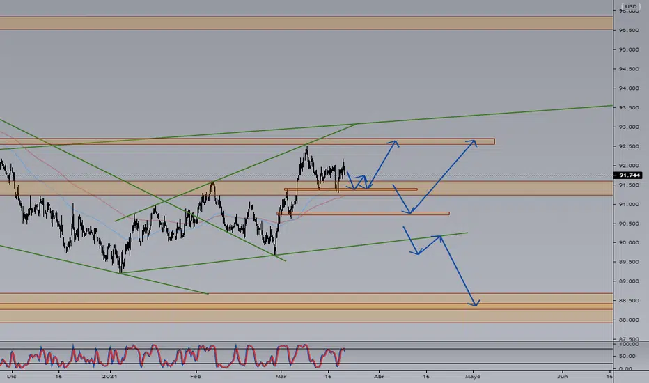 DXY en zonas de reversion pero mantiene la figura chartista hacia la alza en mi opinion. Luego de una semana de fuertes noticias para la FED, el DXY mantiene su triangulo expansivo. será semana de consolidación?
