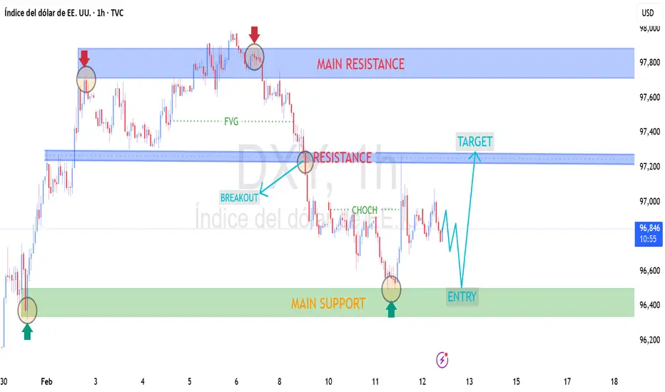 El DXY se encuentra operando dentro de un rango definido entre 96,30 (soporte) y 97,20 (resistencia) después del rechazo en la zona de oferta mayor cercana a 98,00.