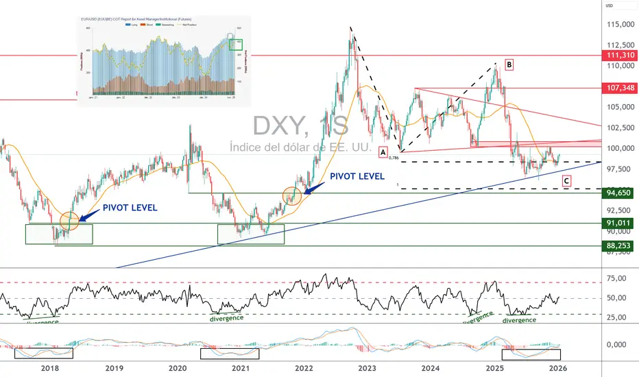 Desde un punto de vista técnico, la incapacidad reiterada del DXY para superar de forma sostenida la zona de 101/102 refuerza la idea de un techo estructural. Mientras esta resistencia no sea superada en cierres semanales, el escenario preferido sigue siendo una consolidación lateral con sesgo bajista.