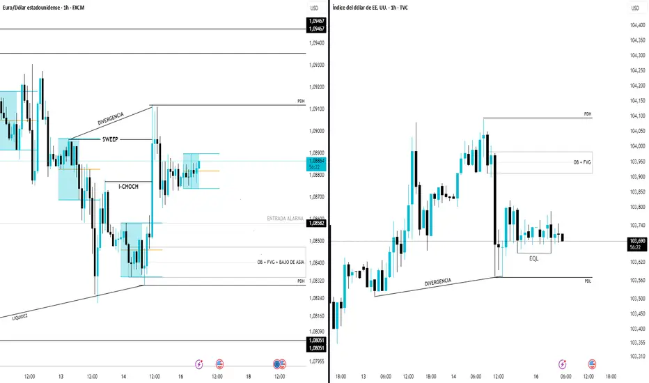 Un rechazo desde la resistencia y una caída hacia la zona de demanda en 1.08582, donde confluyen un Order Block (OB), una zona de Fair Value Gap (FVG) y el mínimo de Asia.