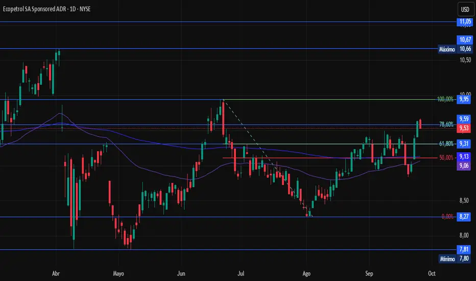 El ADR de Ecopetrol que cotiza en la bolsa de Nueva York ha estado subiendo recientemente desde la zona de los 8,85 dólares hasta el 9,59, por donde está el 78,6% retroceso Fibonacci de la última caída que tuvo durante julio.