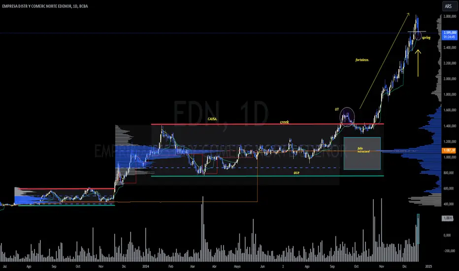 2. Estructura de Acumulación y Ruptura del Creek Desde enero de este año, se formó una estructura de acumulación. Tras un extenso recorrido dentro del área de valor del perfil de volumen, el precio rompió el creek de la estructura, validando la intencionalidad alcista.
