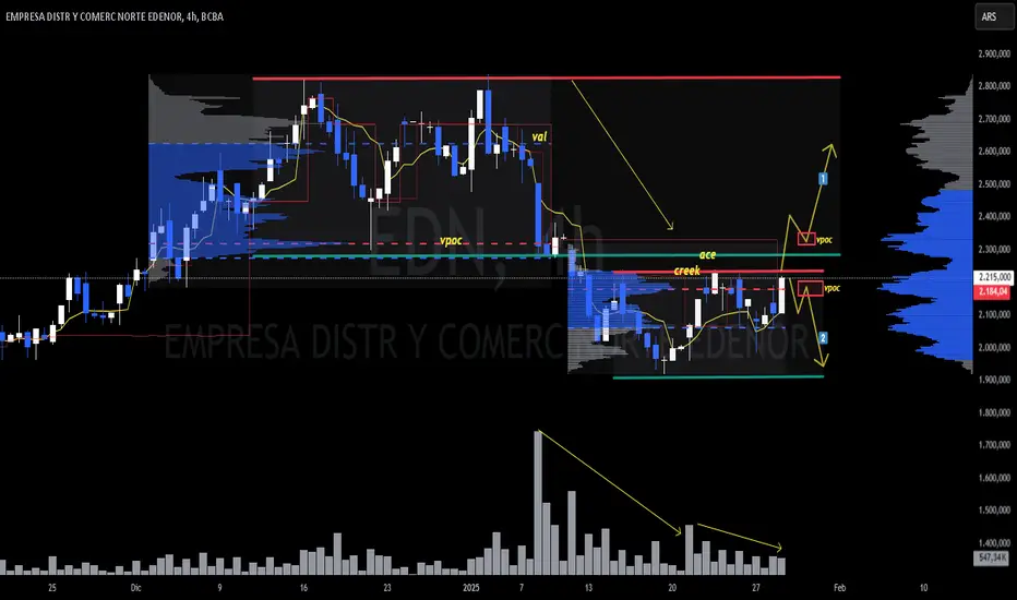 Si el precio logra romper el creek y el ACE, junto con el VPOC del perfil superior, podríamos esperar un testeo del VPOC. En caso de consolidarse por encima, el precio podría continuar su recorrido dentro del Área de Valor hasta el borde superior o, en un escenario más conservador, hasta el VAL del perfil superior.