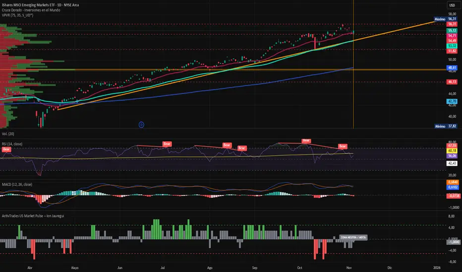 Desde el punto de vista técnico, el etf ISHARES MSCI Emerging Markets Index (EEM) cotiza en torno a 55,12 dólares al cierre de ayer, con una estructura claramente alcista. Las medias móviles de 50,100 y 200 días mantienen señales de compra, y el RSI (56%) indica fortaleza moderada sin entrar en sobrecompra. MACD se mantiene por encima del histograma que parece estar corrigiendo en negativo. El punto de control (POC) se haya entorno a los 48,61 dólares, en la zona de soporte de la última consolidación alcista. El soporte primer soporte actual se haya en torno a los 54,51 dólares y el soporte clave en los 51,82 dólares, mientras la resistencia inmediata parece presentarse en la zona de máximos actual en 56,31 alcanzados el 29 de octubre. Un cierre sostenido por encima de este máximo podría abrir la puerta a los 58 dólares. Por debajo, una ruptura bajista abriría correcciones en dirección a los 50 dólares buscando el punto de control. El indicador ActivTrades US Market Pulse se haya en zona neutral de riesgo.