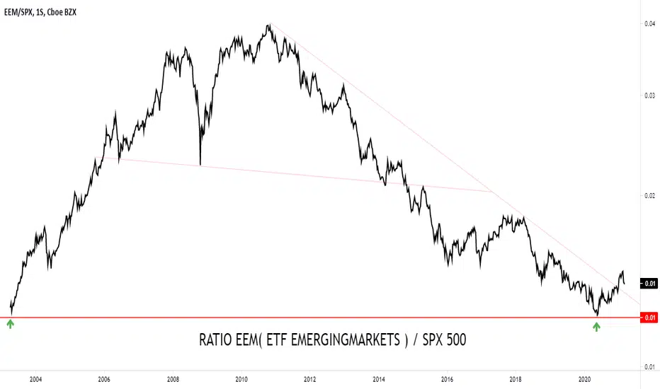 Hace solo dos meses atrás te mostraba como este ratio se había acercado sobremanera a su principal zona de resistencia , esto es la linea tendencial declinante que originara allá lejos y hace tiempo, en el año 2010http://btlplus.blogspot.com/2020/12/ratio-eem-spx-500-update.html. Pues bien durante fines del año 2020, principios de este 2021, esa linea fue quebrada por primera vez, tal se muestra en la figura adjunta, ya que si bien ambos activos ( EEM y SPX 500 ) han subido y mucho ( a tal punto de estar em ambos casos en zona cercana a máximos históricos ) el primero de estos lo hizo en un % mayor al segundo y de allí la superación de la linea citada, evento por cierto muy relevante y por lo tanto lo remarco.