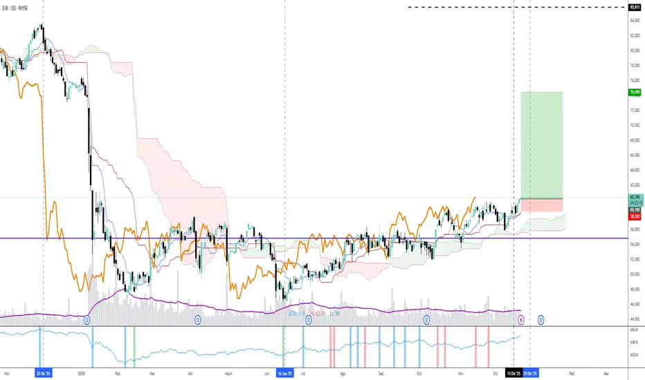 Desde la perspectiva de Ichimoku, EIX mantiene una estructura alcista saludable. El precio se encuentra claramente por encima de la nube, respetando la Kijun-sen y desarrollando una Kumo futura positiva, lo que sugiere continuación del movimiento en marco swing.