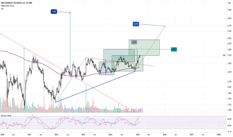 Semanal, ruptura de directriz bajista proveniente de principios 2023 que rompe definitivamente en diciembre 2024, Objetivo 3,870€.