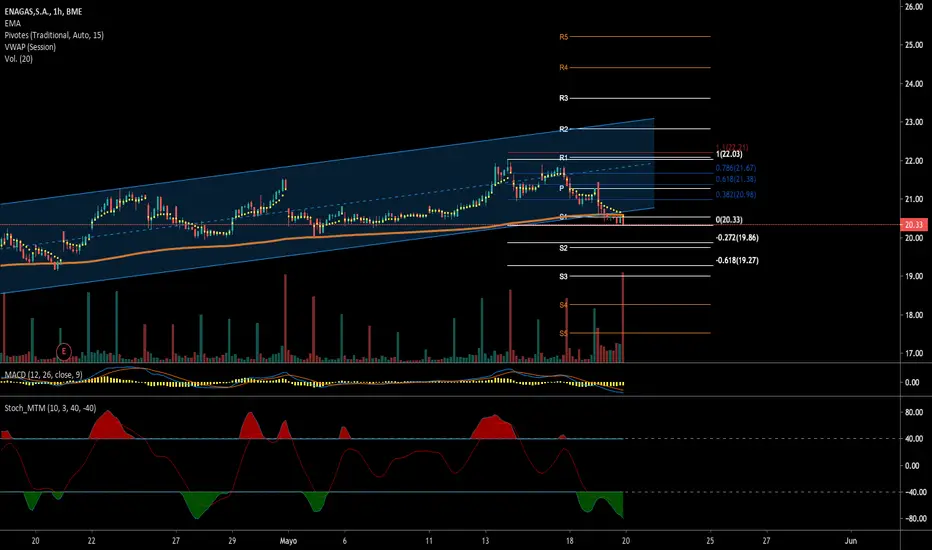 En gráfico de 1h. tenemos la misma rotura del canal. En este caso la linea VWAP nos indica que el valor esta barato (de ahí también el volumen que vemos) y que podríamos ver una corrección en el día de hoy hacia los niveles del anterior soporte 20,54€