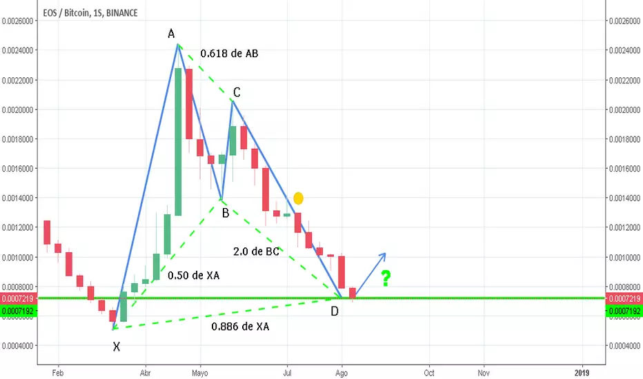 Buenas, les quiero compartir esta oportunidad de inversion para la moneda EOS contra el par BTC. Que viendo el grafico habria completado lo que seria un patron Bat perfecto. Lo que podria significar que su precio suba ¿y porque no? empezar una tendencia alcista. Todo esto depende del movimiento del BTC