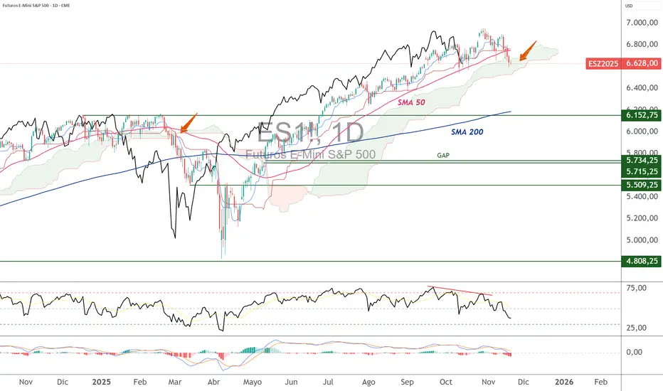 El índice S&P 500 (el contrato de futuros del S&P 500 en este análisis) se encuentra actualmente en un punto de inflexión técnico decisivo. Tras varios meses de avance sostenido desde la caída de marzo/abril, los precios vuelven a probar una zona clave donde convergen varios soportes dinámicos: la nube Ichimoku diaria, la media móvil de 50 días (SMA 50) y, más abajo, la media móvil de 200 días (SMA 200), que coincide con el anterior máximo histórico de 6.150 puntos. Esta confluencia convierte la fase actual en un auténtico momento de verdad técnica para el mercado bursátil estadounidense y para las acciones de las GAFAM.