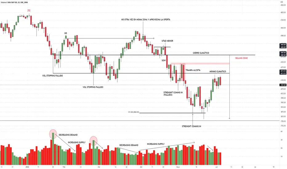 Fundamentalmente se vieron dos volume stopping fallidos hasta ahora, el del 24-01 y el del 24-02 que no fueron aprovechados por la demanda. La historia se complica un poco para los compradores con la vela del 22-04 que quiebra definitivamente la zona del cierre climático. Esto fue positivo para los vendedores, dado que a partir de allí se profundiza el dominio de los mismos, acumenta el volumen en velas bajistas y la demanda ni siquiera tiene la fortaleza como para ir a testear máximos del rango de trading. Si bien el 12-05 volvieron a parar el precio, nuevamente a partir del 25-05 vuelve a decrecer el volumen en velas alcistas por ende, es normal que en las próximas ruedas testee mínimos de estructura, sobre todo, zona de los 3928.