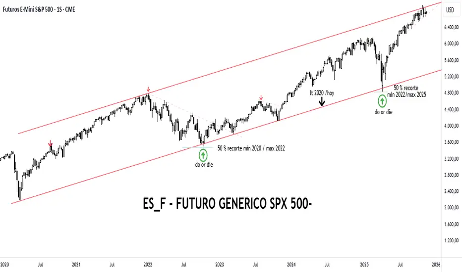 Arranca una nueva semana y así como hace unos pocos días atrás te mostraba el corto plazo a través del índice en su variante spot y donde estaba/esta su gran soporte en esta instancia en terminos base cierre ( ver informe ) me pareció interesante hacer un pequeño refresco de la situación de mediano plazo a través del futuro de dicho índice, dado que por un lado y en materia de soporte pudo aguantar hasta aquí el mismo que te mostrara para el corto, mas en la big picture en bueno recordar que la ultima corrección, baja o caída o como quieran llamarla comenzó tras impactar y respetar su principal resistencia, la linea superior del canal ascendente que tiene su origen en aquel mínimo del año 2020 y que aun se mantiene vigente. Por lo expresado, quedan bien definidos las areas/líneas/zonas que representan los soportes y resistencias a poner en foco.