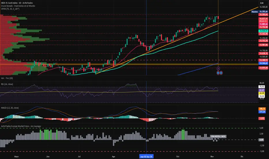 En términos técnicos, el IBEX 35 consolida su posición en la zona de los 16.000-16.100 puntos. En el largo plazo los cruces de medias permanecen estables marcando una clara tendencia alcista. Se perfila como soporte clave a corto plazo los 15.755 puntos. La apertura ha empujado el precio a los 16.027 puntos en la primera hora de negociación con una tendencia correctiva. Hay que tener en cuenta que el RSI está corrigiendo desde una sobrecompra excesiva de 70% estando en este momento en 60,39% lo que podría llevar al precio de vuelta a los 16.000 puntos en esta jornada. MACD permanece en zona positiva pero el histograma está entrando en territorio bajista en la jornada de hoy. Si la resistencia de máximos históricos del 29 de octubre en 16.205,66 puntos es perforada podríamos ver una subida en busca de los 16.500 en la próxima semana. Si el soporte actual de corto plazo se pierde veríamos una corrección en dirección a los 15.442 puntos. La falta de impulso y ausencia de referencias macroeconómicas relevantes podrían derivar en un movimiento lateral durante las próximas sesiones.