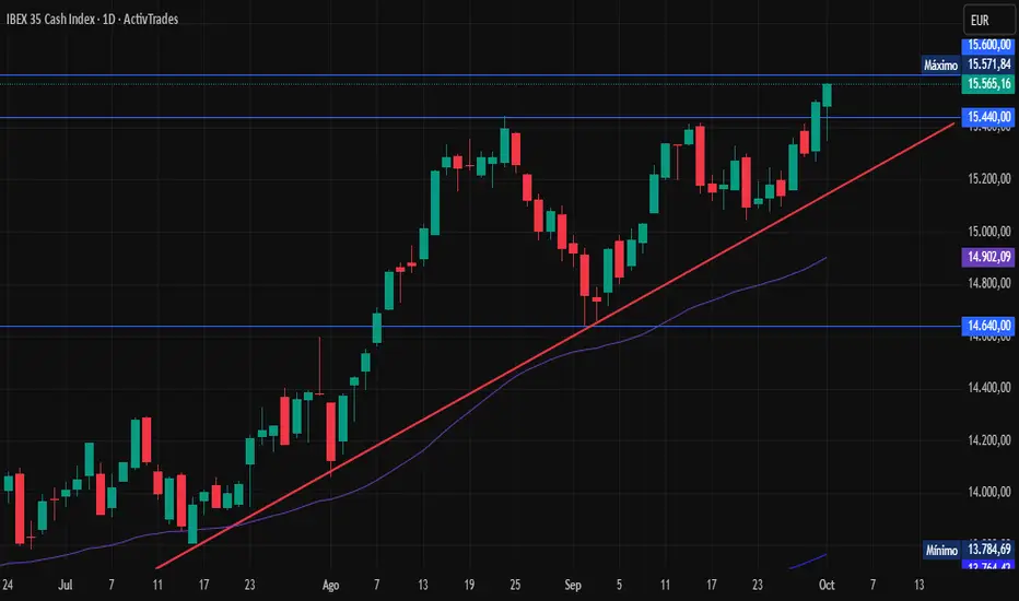 El Ibex 35 de España rompió por encima de la zona de resistencia en los 15.440 puntos y se acerca a los 15.600 puntos por primera vez en su historia.