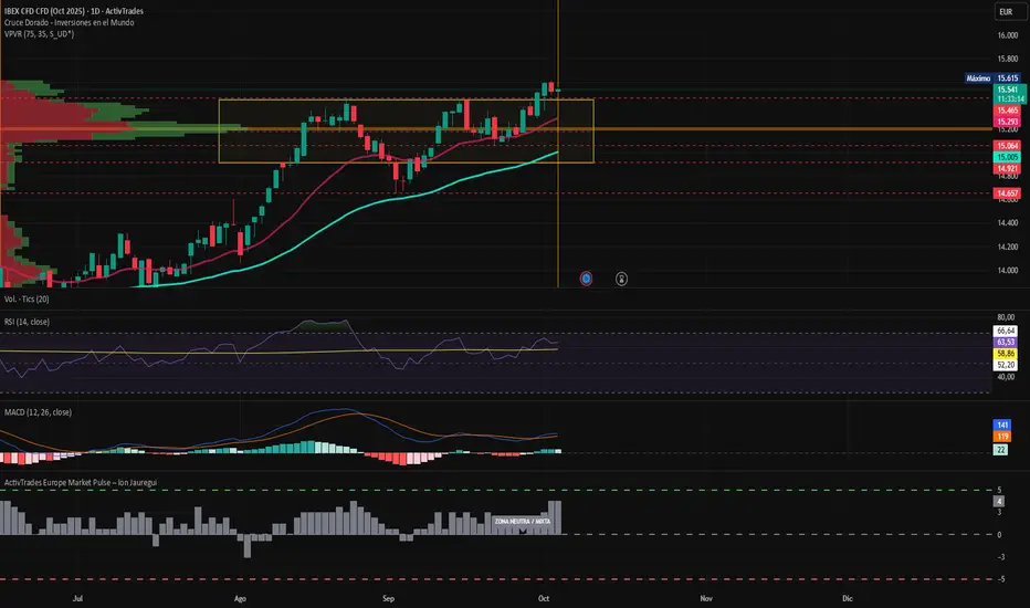 Los indicadores muestran un RSI en 63,5% y un MACD positivo, aunque lateralizado. El indicador ActivTrades Europe Market Pulse apunta a un escenario de “risk-on” suave, apoyando la continuidad de la tendencia mientras el índice permanezca sobre 15.300 puntos y el techo de 15.465 superado desde el martes.