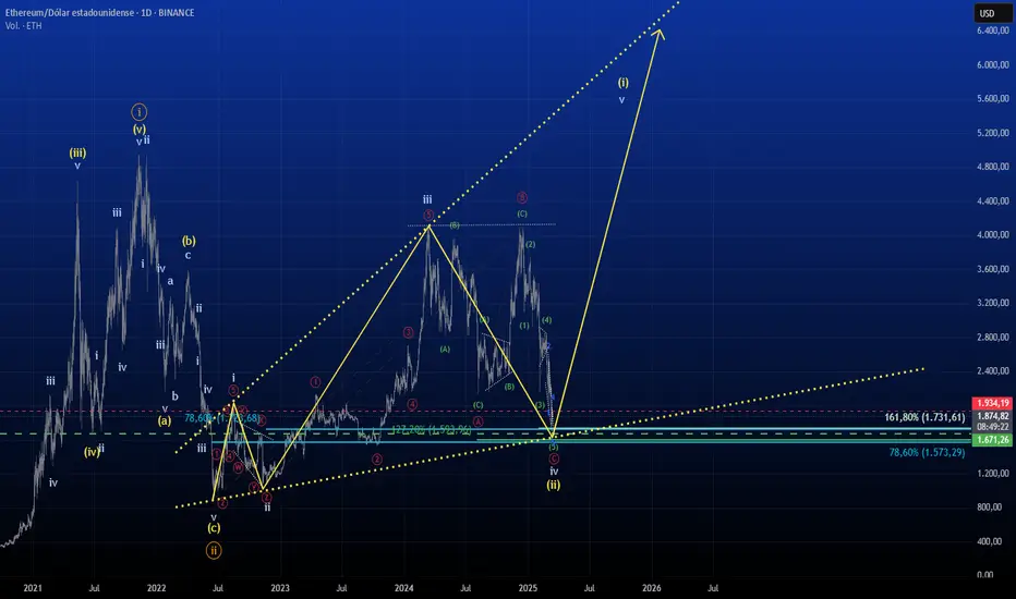Paciencia.... mucha paciencia con ETH pero es una cripto que no puede faltar en tu cartera me parece... conteo en elliot... complicado... hay quienes cuentan este retroceso como una onda 2 de grado QUE ES MUY VALIDO... pero a mi no me convence y sigo pensando que es un retroceso muy profunda de una onda 4 en diagonal expansiva para la 1 de grado mayor... QUE QUILOMBO.. los que manejan elliot capaz lo entienden o lo explique muy mal jajaja, aclaro en las diagonales inicales expansivas la onda 4 puede terminar por debajo de la onda 1, por ende tengo marcadas 3 zonas de reversión MAXIMO para que este conteo sea VALIDO que son 1.700 usd/ 1670 usd y 1570 usd... si cae por debajo de ello le dare la derecha a los que ya cuentan este retroceso como onda 2 de grado mayor, hasta que ello no suceda mantengo mi postura... al rebote? lo espero arriba de los 5/6 k aprox