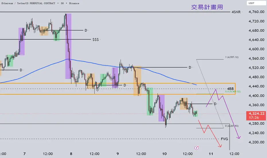 上方 4BB 區($4,400–$4,450) 為明顯壓力帶