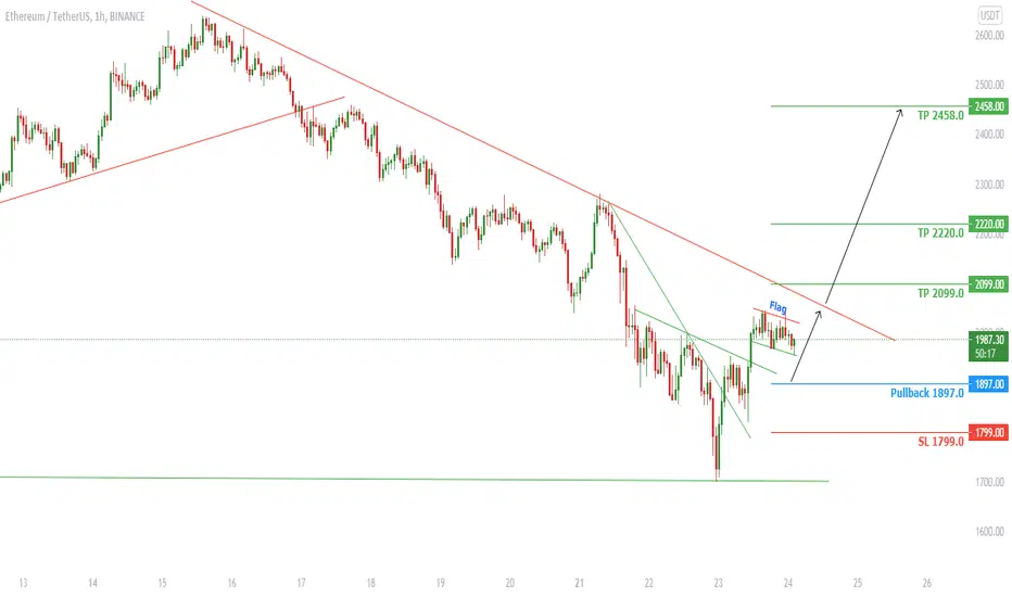Aquí en ETHUSDT vemos que el precio se ha roto por encima de la resistencia a corto plazo y ha formado una bandera alcista que sugiere que el precio subirá, sin embargo, el retroceso podría ocurrir en 1897.0 antes de que el precio suba a la resistencia a largo plazo. Si el precio se rompe por encima de la resistencia, potencialmente puede ir 2099.0, 2220.0