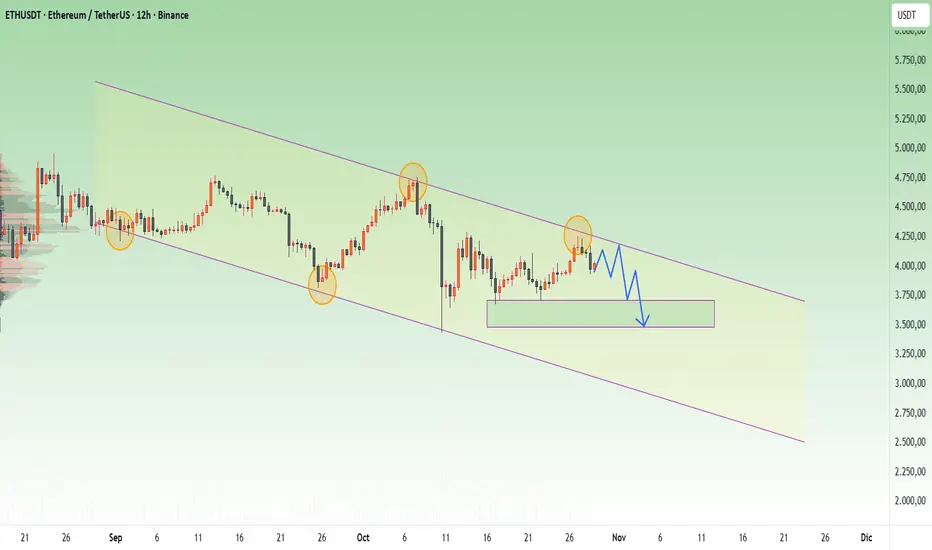 El escenario más probable es que ETH se mueva lateralmente alrededor de esta área antes de continuar su descenso hacia 3.470 USD, que coincide con la parte inferior del canal descendente.