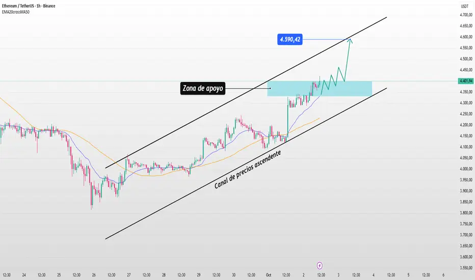 ETH se mantiene en tendencia alcista, con la estrategia priorizando la compra en correcciones cerca de la zona de soporte. Objetivo a corto plazo: 4590.